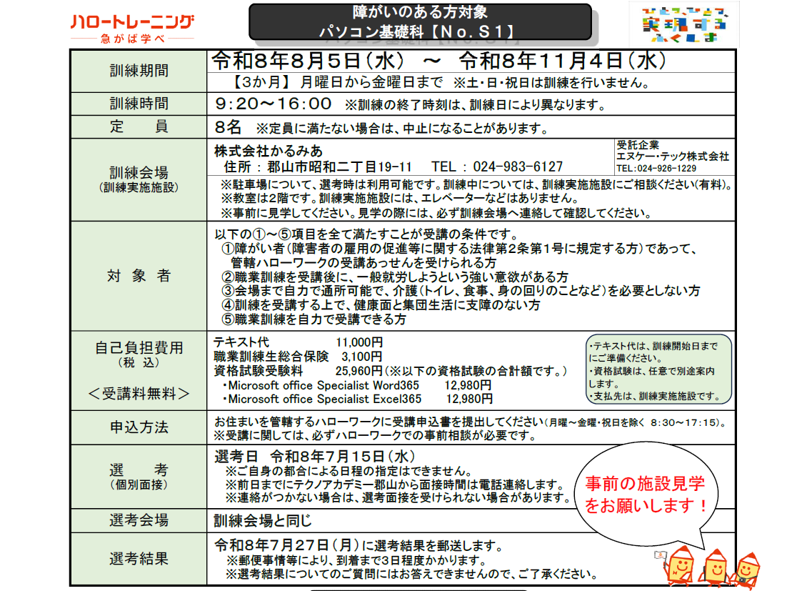 8月からの3カ月間、障がいのある方向けの「ハロートレーニング」をかるみあで実施することになりました😊
